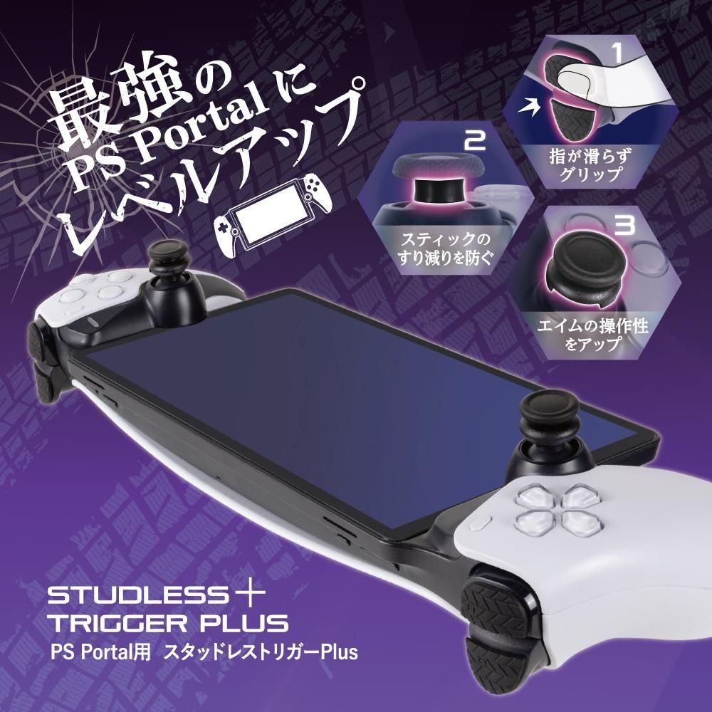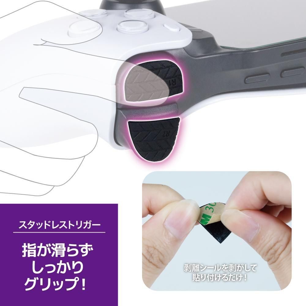 「スタッドレストリガー」は、PS PortalのL1/R1/L2/R2ボタンに貼り付けることで、指先が滑ってしまうことを防止する、タイヤの凹凸を模したデザインのアタッチメントシールです。シール部分に使用されているシリコン糊は再剥離性も高く、ゆっくり剥がすことで糊残りせずキレイに剥がすことも可能です