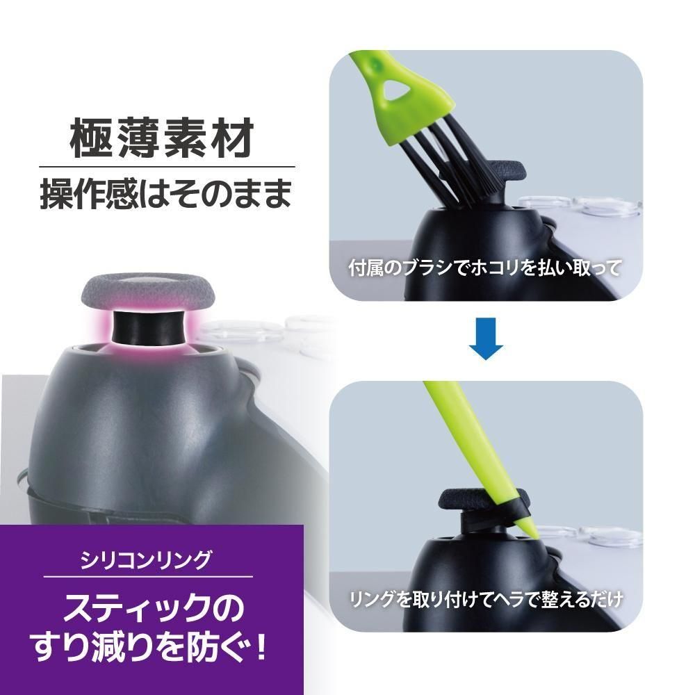 「シリコンリング」は、PS PortalのLRスティックスティック軸部分が摩耗して削れてしまうことを防止する保護アイテムです。大切なPS Portalを長く使いたいというニーズに応えるため、本セットに「シリコンリング」を追加しました。シリコンリングはシリコンゴムの極薄素材でできており、操作感を損なうことなくご使用いただけます。取り付け方は簡単で、付属のお手入れ用ブラシでLRスティック軸をクリーニングしてから、シリコンリングを指で広げて軸に装着後、お手入れ用ブラシの先端ヘラで形を整えて取り付け完了です※2。シリコンリング自体を消耗品ととらえ、予備も含めた合計10個が付属しています。また、シリコンリングのカラーもブラックなので、装着後に見た目も違和感がありません。